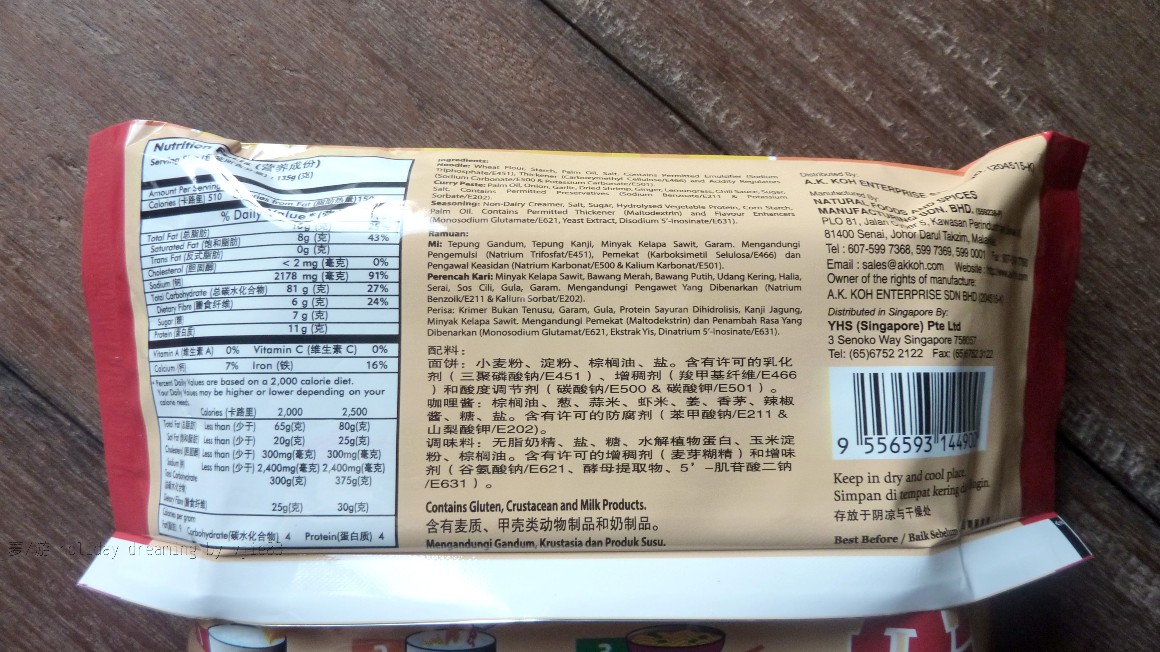 | ▲A1咖哩叻沙麵的營養標示、使用食材、過敏警示、生産商與分銷商資訊和存放方式 Nutrition facts, ingredients, allergic warning, manufacturer & distributors info and storage method of A1 Curry Laksa Noodles |